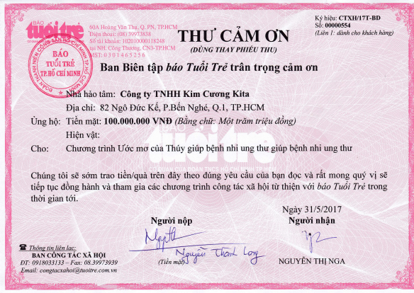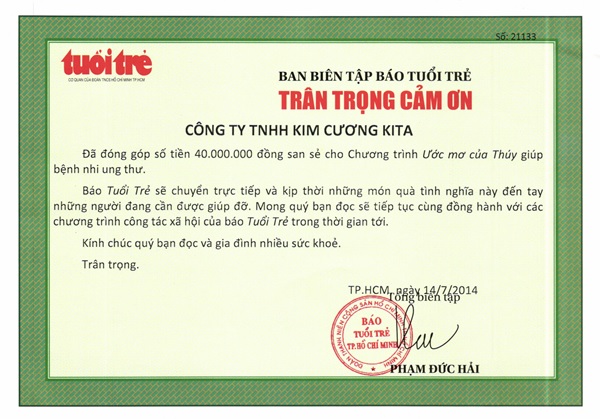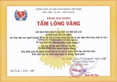 Ngày 25/11/2015 Công ty TNHH Kim Cương KITA nhận bản ghi nhận tấm lòng vàng của hội bảo trợ người tàn tật và trẻ mồ côi thành phố Hồ Chí